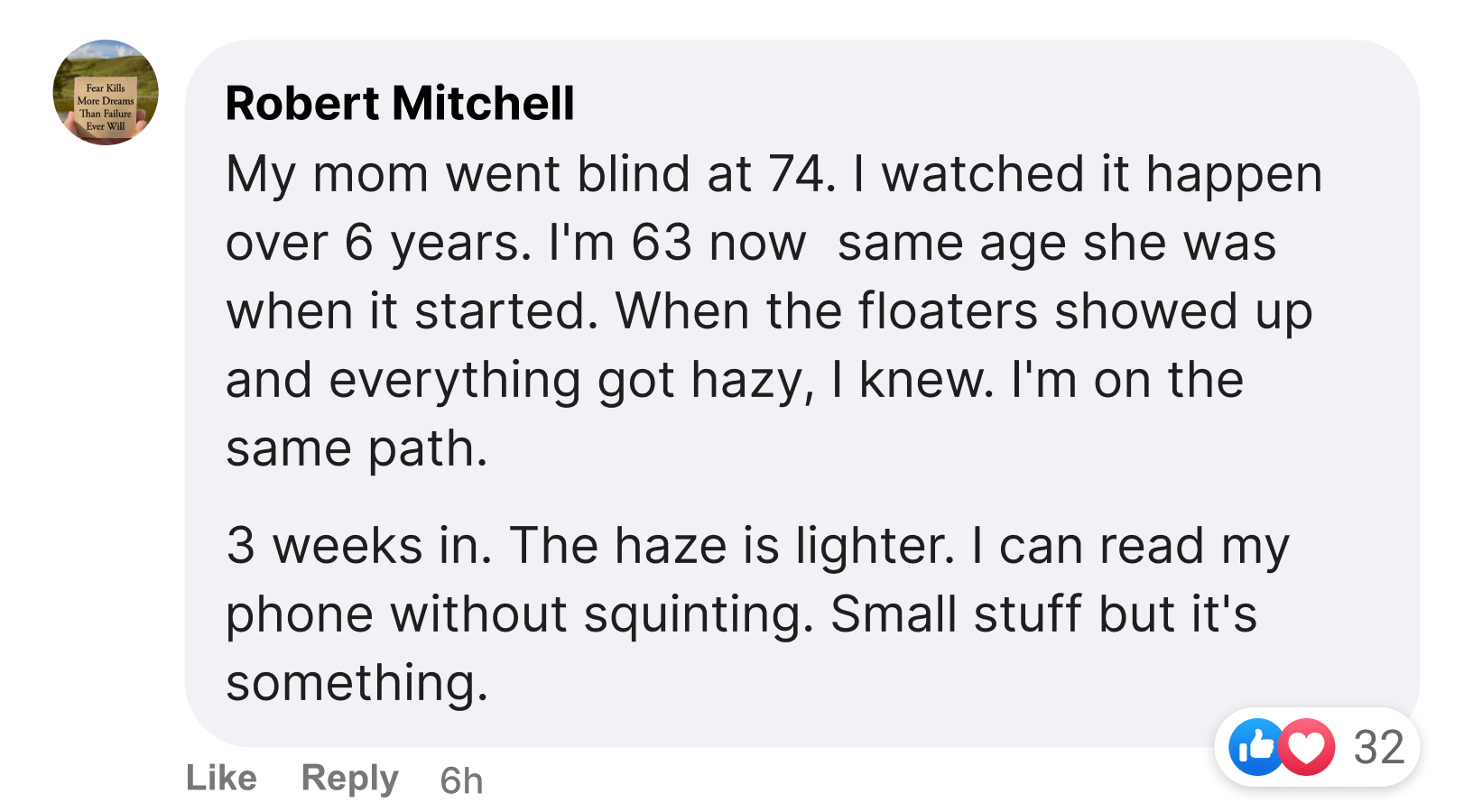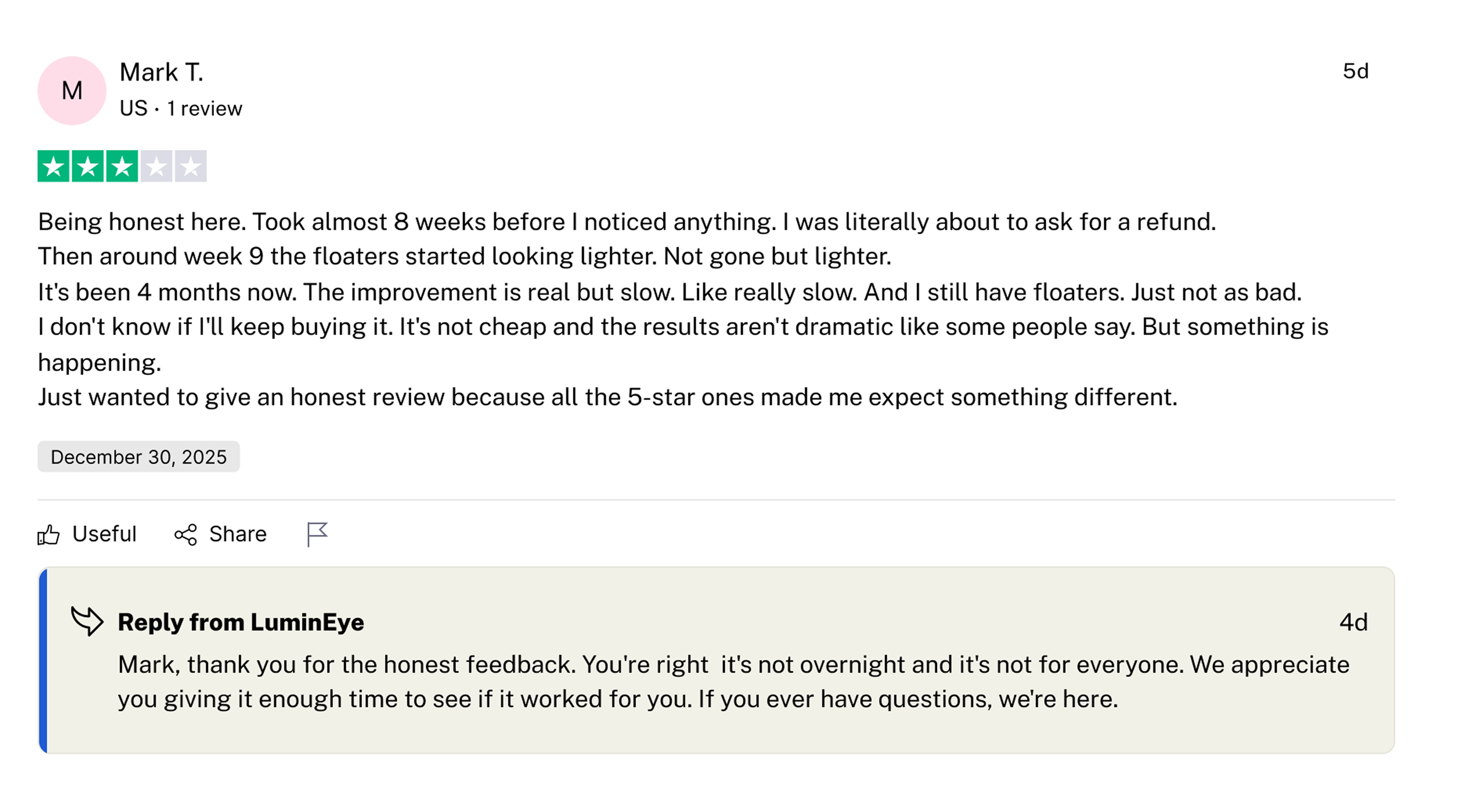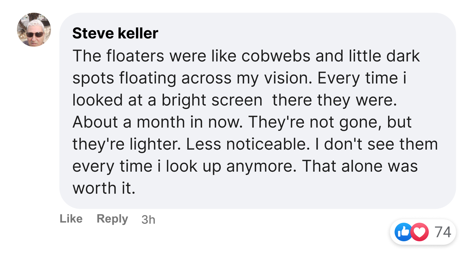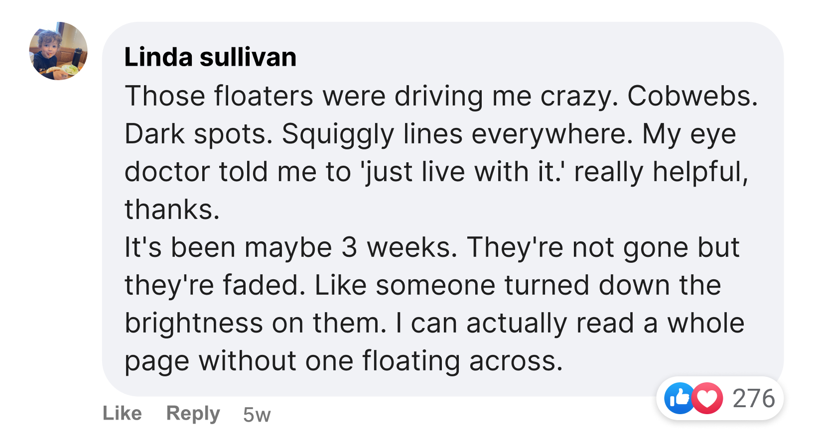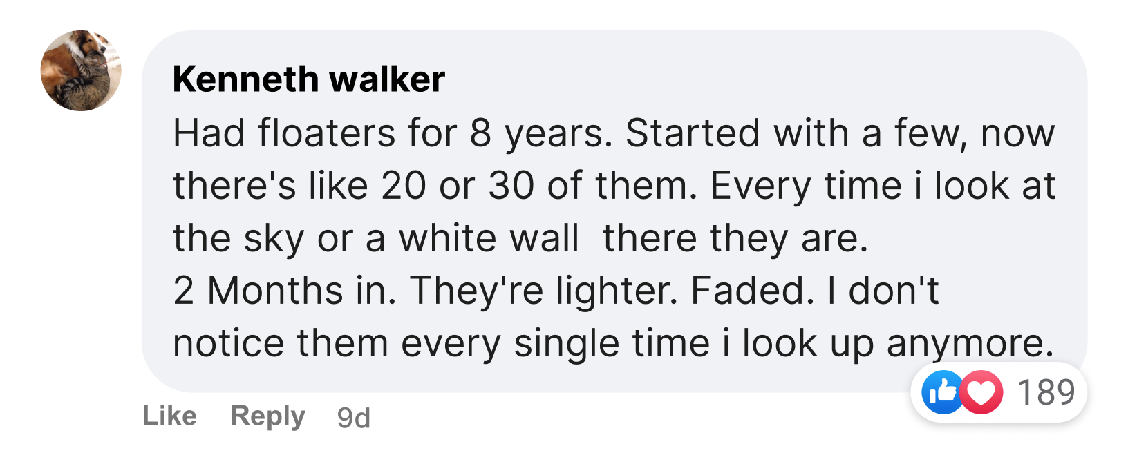 One customer said "in 16 days my floaters started clearing" — that's faster than average, but it happens