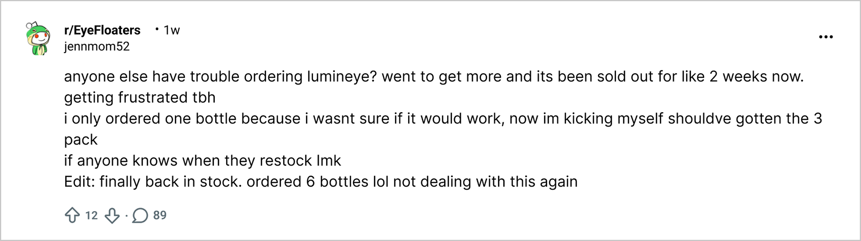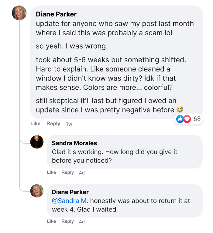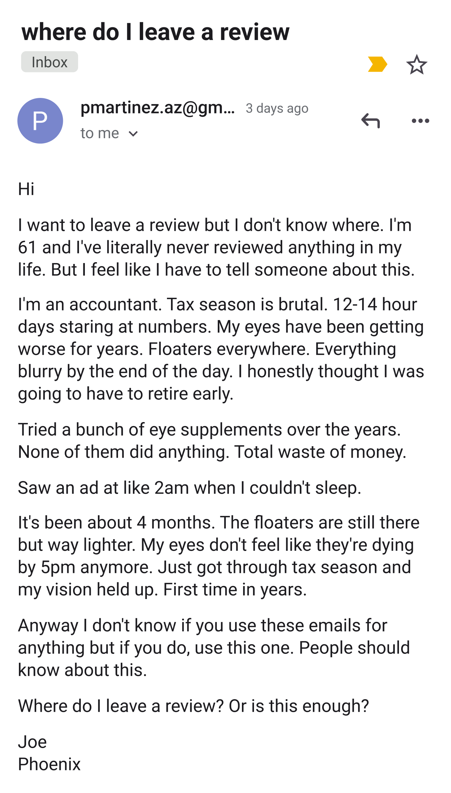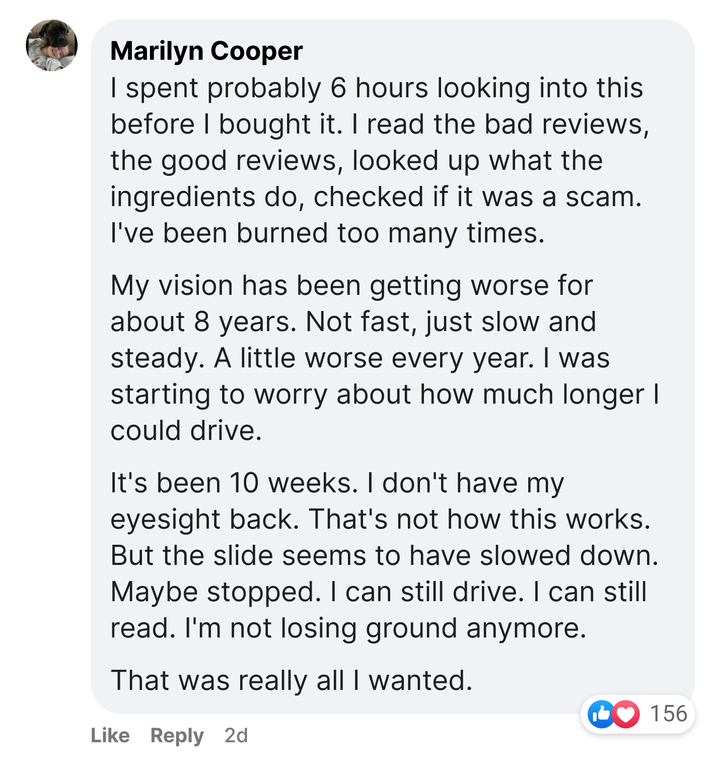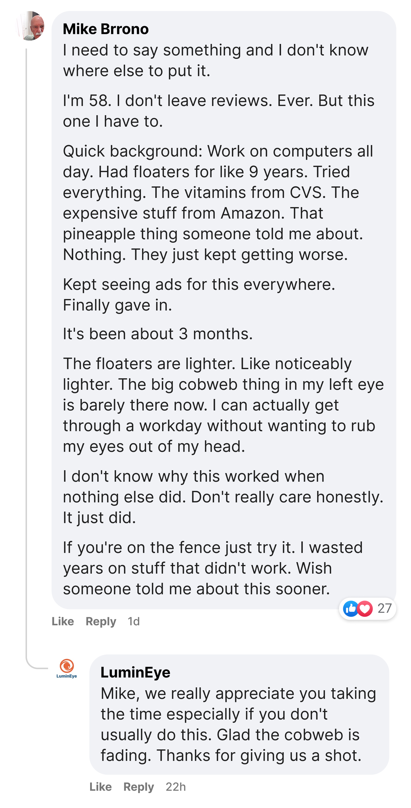 One customer said "in 16 days my floaters started clearing" — that's faster than average, but it happens