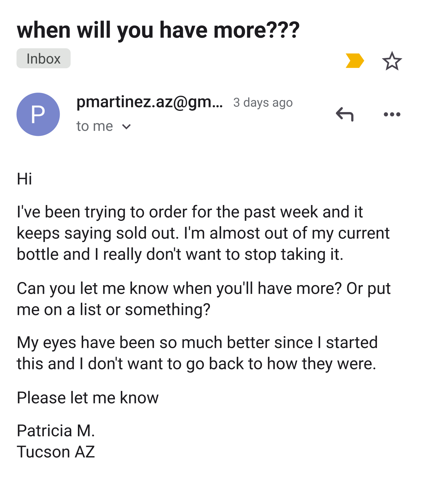Conditions and timelines may vary, but the journey to improved ocular health begins the moment our potent ultra-concentrated liquid is placed under your tongue and enters your bloodstream to start working for you!
